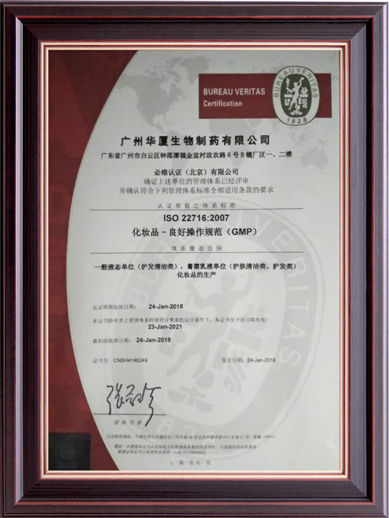 公司始創(chuàng)建于2012年,經(jīng)過(guò)八年的健康發(fā)展,已經(jīng)成為可以從事妝字號(hào)、消字號(hào)、械字號(hào)等系列產(chǎn)品生產(chǎn)加工的大型企業(yè)。企業(yè)坐落在美麗的廣州白云區(qū)鐘樓潭鎮(zhèn),擁有面積超過(guò)15,000平方米的生產(chǎn)廠房。廠房寬敞明亮,設(shè)計(jì)科學(xué)新進(jìn),擁有十萬(wàn)級(jí)的生產(chǎn)車(chē)間,局部環(huán)境可以達(dá)到一萬(wàn)級(jí)別;設(shè)備多采用新進(jìn)的進(jìn)口設(shè)備,自動(dòng)化程度非常高,擁有一流的生產(chǎn)設(shè)施。工廠同時(shí)通過(guò)了ISO22716和GMCP質(zhì)量管理認(rèn)證,擁有一流的質(zhì)量管理體系。廠